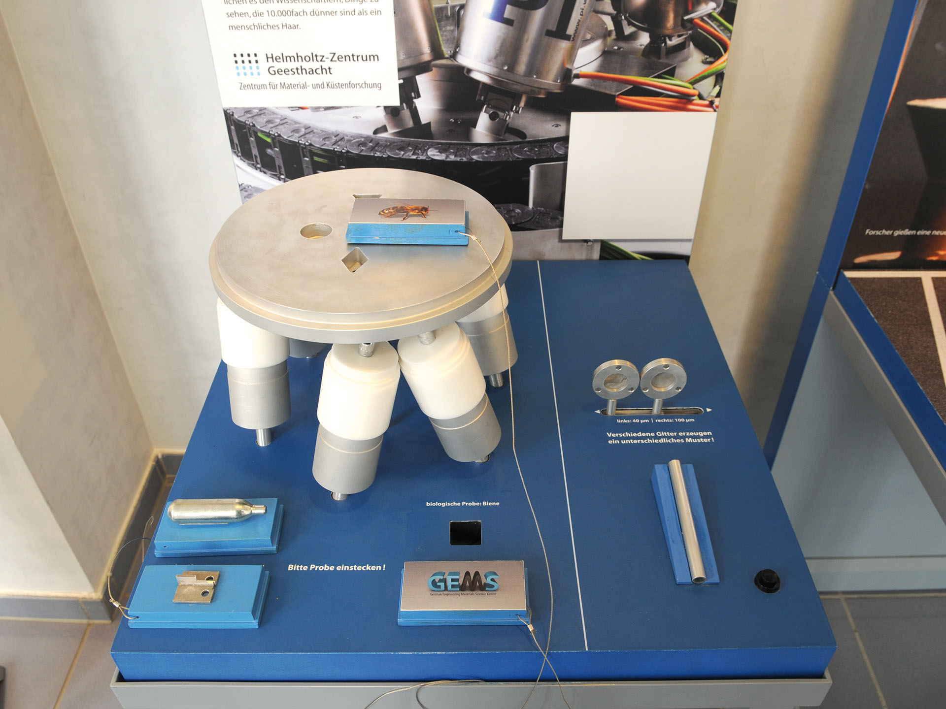 Wissenschaftler im GEMS (German Engineering Mate- rials Science Centre) benutzen Neutronen oder Synchrotron-Röntgenlicht, um Strukturen zu erfassen, die so klein sind, dass sie selbst mit dem Mikroskop nicht mehr gesehen werden. Auf diese Weise wird sogar die Anordnung der Atome sichtbar gemacht. Die Forscher beobachten Wasserstoffatome, dringen tief in die Schweißnaht ein und blicken in den Kopf einer Biene. Forscher nahezu aller Disziplinen nehmen mit Synchrotron-Röntgenlicht ihre Proben unter die Lupe: Metalle ebenso wie Kunststoffe oder biologische Moleküle. In viele Metalle dringt Röntgenlicht nur begrenzt ein. Dann werden Neutronen benötigt: Diese durchleuchten Metalle besonders tief.