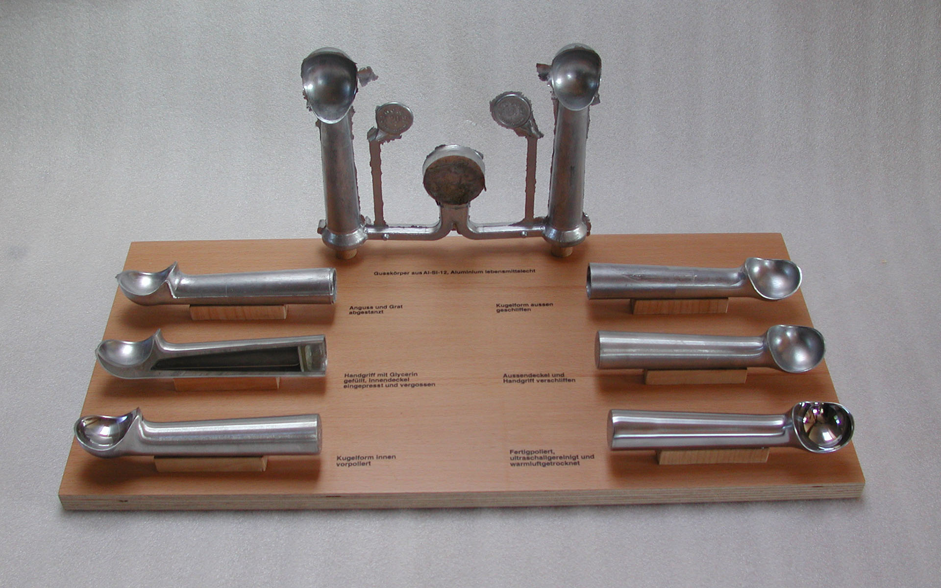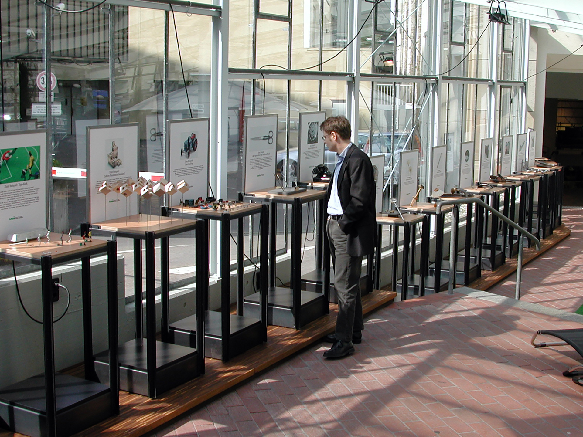 Die Präsentations-Displays im Raster 400 mm x 400 mm erzählen die Produktgeschichte: Herstellungsschritte, Materialien, Fertigungstechnik und handwerkliche Perfektion werden sichtbar und zeugen somit von Qualität und Wertigkeit. Eine erklärende Text-Grafik gibt Hintergrundinformationen und zieht optisch den Blick auf die ausgewählten Objekte. Die Displays sind mobil und können in den verschiedenen Filialen rotieren.