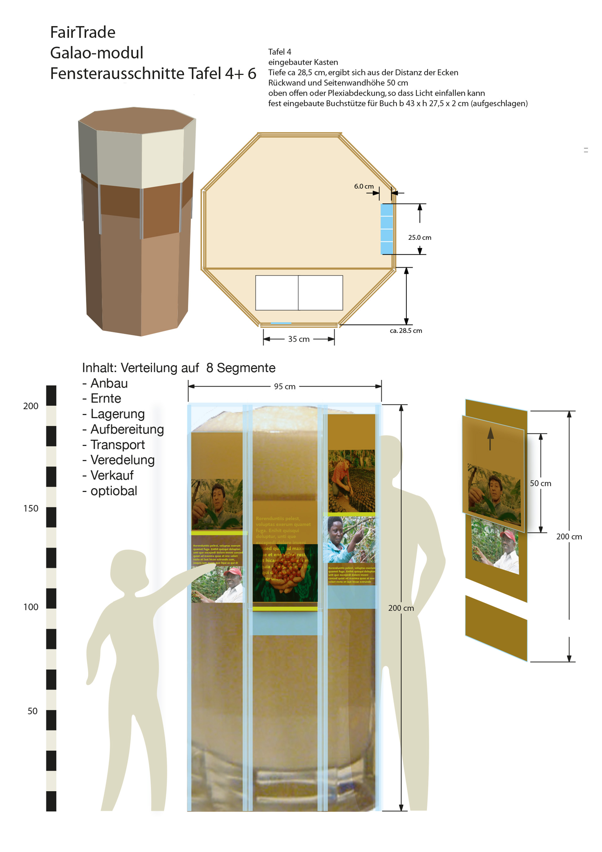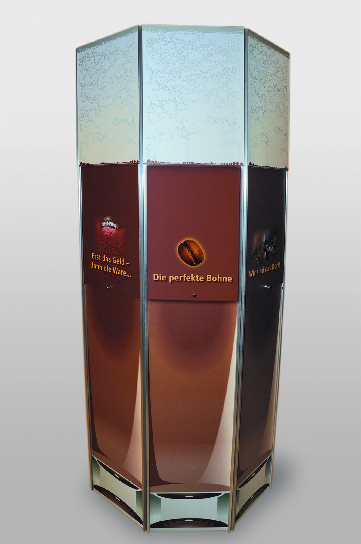 Das Präsentationsmodul „Galaoglas“ besteht aus 8 Präsentationsflächen mit Schiebeelementen. Im Ruhezustand zeigen die Schiebetafeln das jeweilige Thema mit Titelbild. Nach Hochschieben dieser Tafel unter die Milchschaum-Ebene erscheint die erklärende Bild- und Textebene. Zusätzlich zeigt eine eingelassene Klein-Vitrine zum Thema Kaffee-Produktion verschiedene Kaffee-Sorten und eine weitere zum Thema Schule und Bildung ein Schulbuch mit Stiften. Nach dem Lesen gleitet die Schiebetafel gedämpft in die Anfangsposition zurück und verschließt die Info-Ebene.