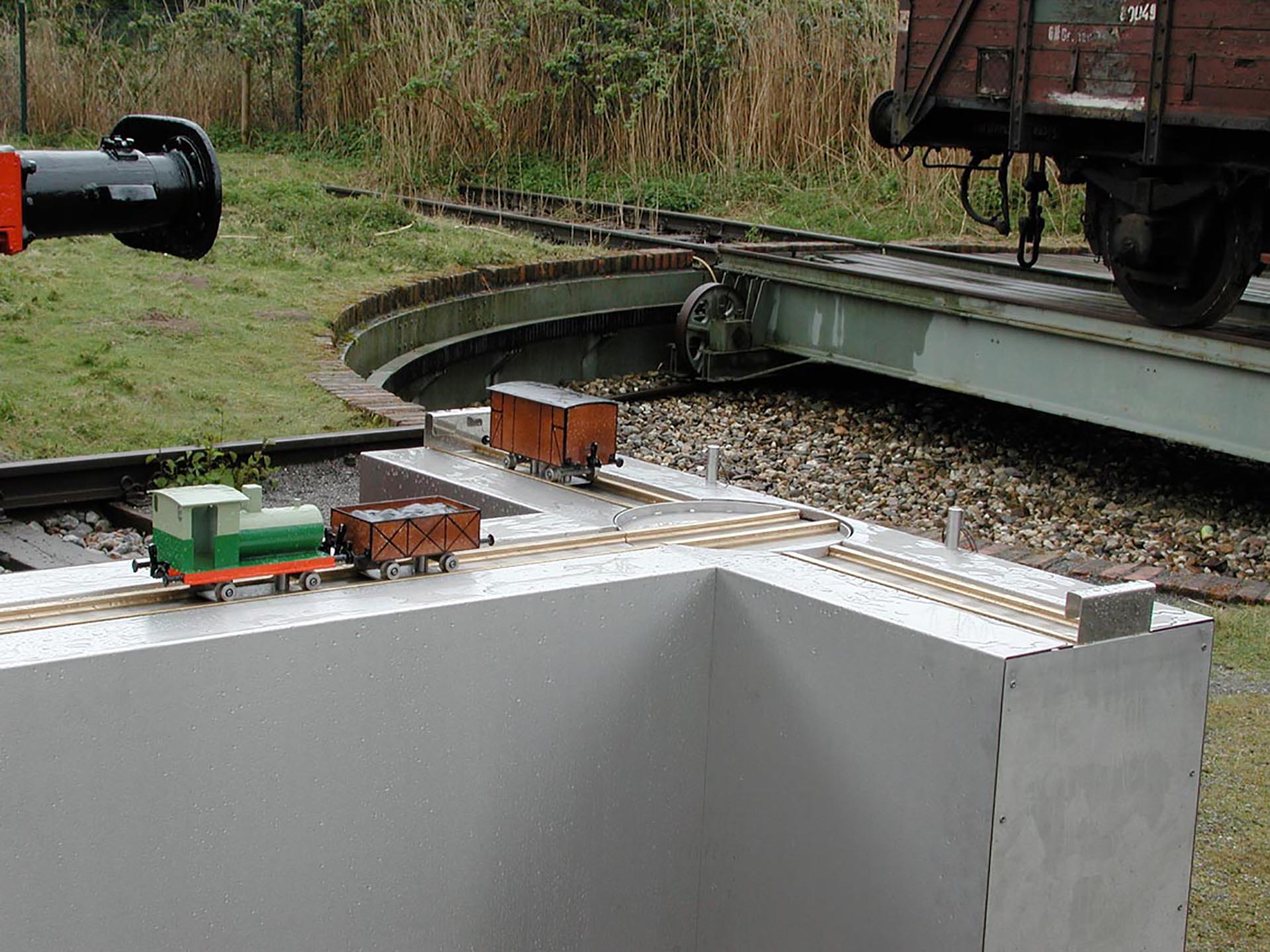 „Vor dem Original” im Außenbereich des Museums können die Besucher am Modell versuchen, eine Lok mit 2 Waggons zu rangieren. Dabei muss die Lok gedreht werden und mit beiden Anhängern das Abstellgleis wieder verlassen. Mittels einer einfachen Mechanik lässt sich die Drehscheibe steuern.